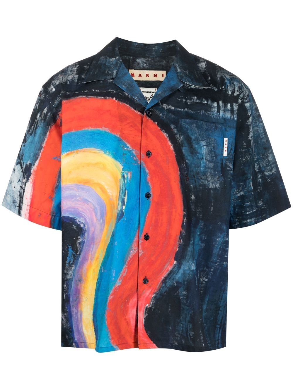 abstract-print cotton shirt blue/multicolour cotton abstract pattern print camp collar front button fastening short sleeves straight hem Imported Composition Cotton 100% SIZE & FIT Model measurements Height 6 ft 2 in(1.87 m) Bust/Chest 36.41 in(92.5 cm) Hips 37 in(94 cm) Waist 29.52 in(75 cm) FittingInformation This piece fits true to size. We recommend you get your regular size Cut for a loose fit Made with a mid-weight non-stretch fabric Washing instructions Hand Wash
