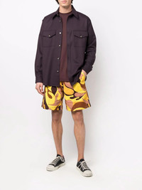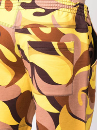 abstract-print track shorts yellow/brown cotton abstract pattern print contrast stitching two side slit pockets rear patch pocket elasticated waistband straight leg Imported Composition Cotton 100% SIZE & FIT Model measurements Height 6 ft 2 in(1.89 m) Bust/Chest 37.79 in(96 cm) Hips 37 in(94 cm) Waist 29.92 in(76 cm) FittingInformation This piece fits true to size. We recommend you get your regular size Designed for a slim fit at the waist and loose over the leg Made with a mid-weight fabric Washing instructions Machine Wash