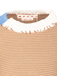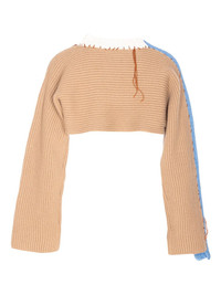 asymmetrical knitted crop sweater Highlights - Beige - Ribbed texture - Contrasting blue side panel - Ruffled white collar - Elongated sleeves Made in Italy Composition Virgin Wool 100% Washing instructions Read Manufacturer Guidelines
