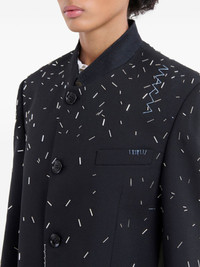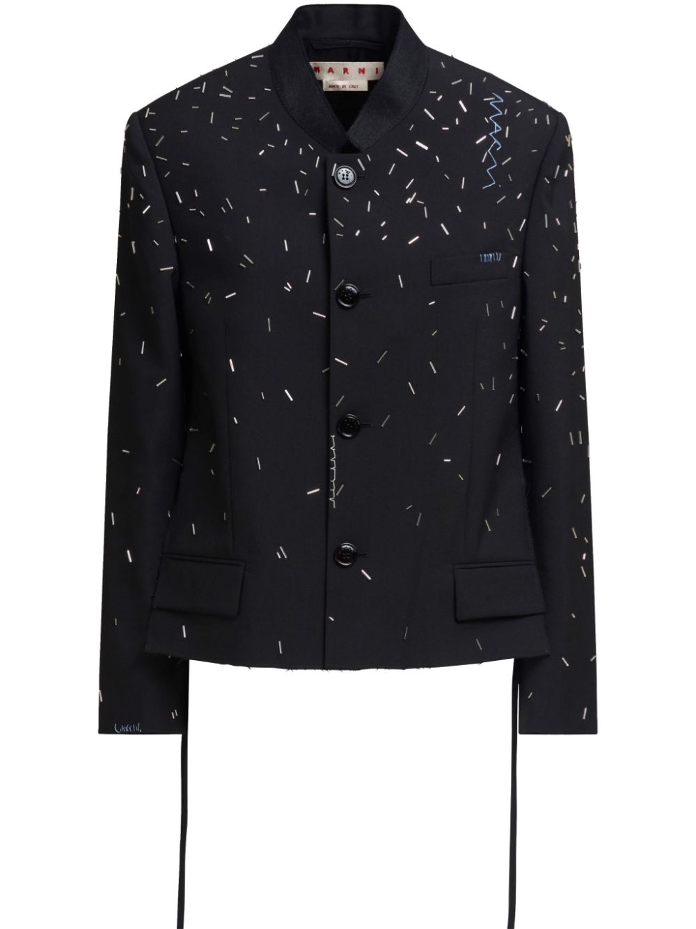 bead-embellished jacket Highlights - Black - Virgin wool - Bead embellishment - Front button fastening - Band collar - Embroidered logo to the side - Long sleeves - Chest welt pocket - Faux pocket detail - Raw-cut hem - Strap detailing Made in Italy Composition Virgin Wool 100%