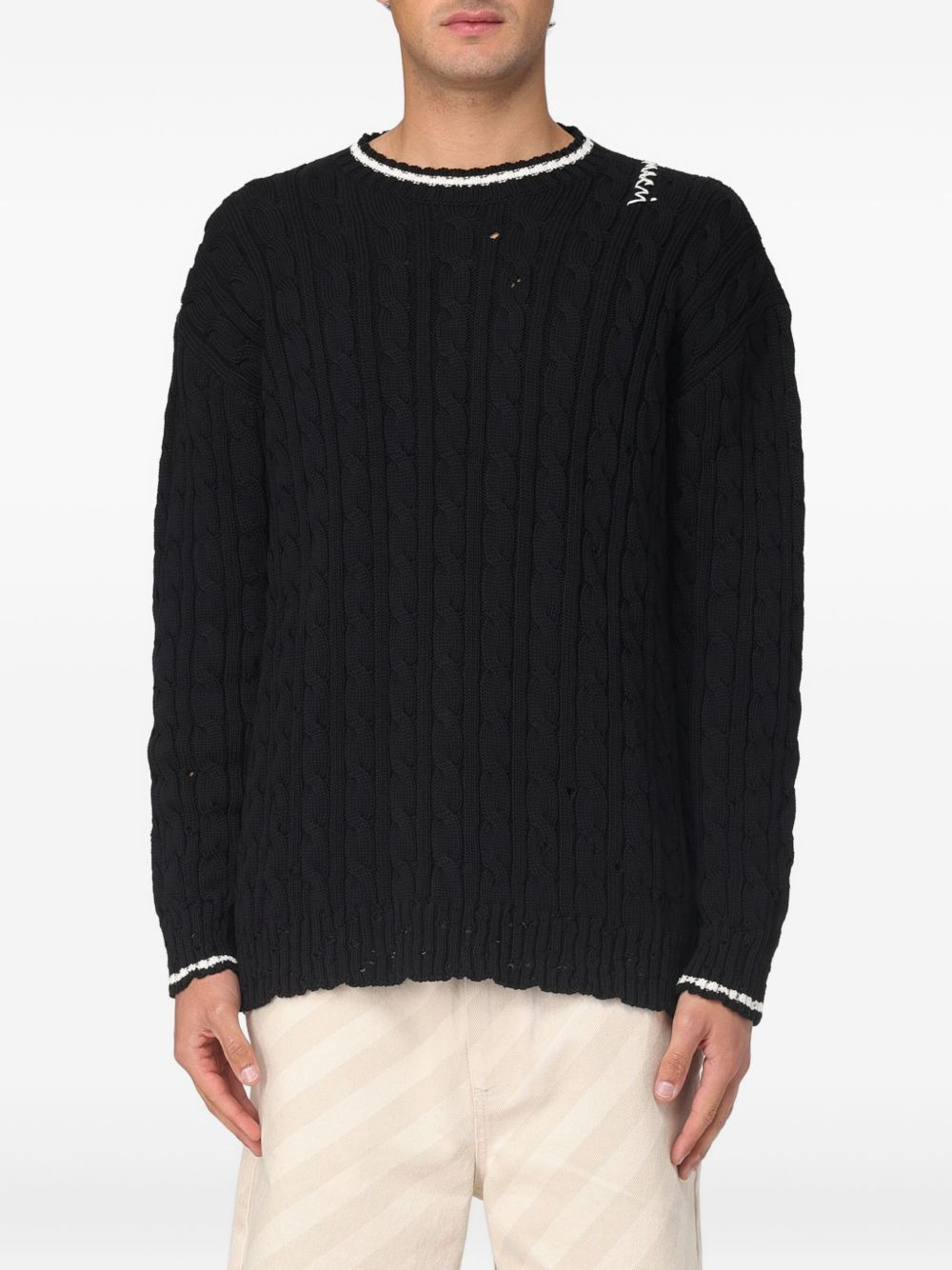 cable-knit round-neck sweater Highlights - Black - Cotton - Cable knit - Round neck - Ribbed trims - Distressed detailing Made in Italy Composition Cotton 100% Washing instructions Read Manufacturer Guidelines