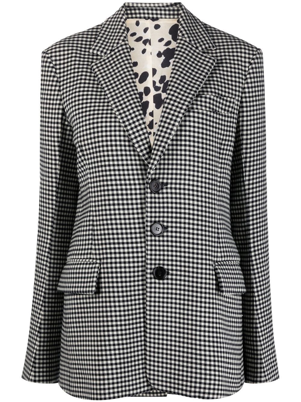 check-pattern blazer black/white virgin wool blend check pattern notched lapels button fastening two front flap pockets long sleeves Made in Italy Composition Outer: Virgin Wool 94%, Spandex/Elastane 5%, Polyamide 1% Lining: Cupro 100% SIZE & FIT Model measurements Height 5 ft 10 in(1.78 m) Bust/Chest 31.49 in(80 cm) Hips 35.43 in(90 cm) Waist 24.4 in(62 cm) Washing instructions Dry Clean Only