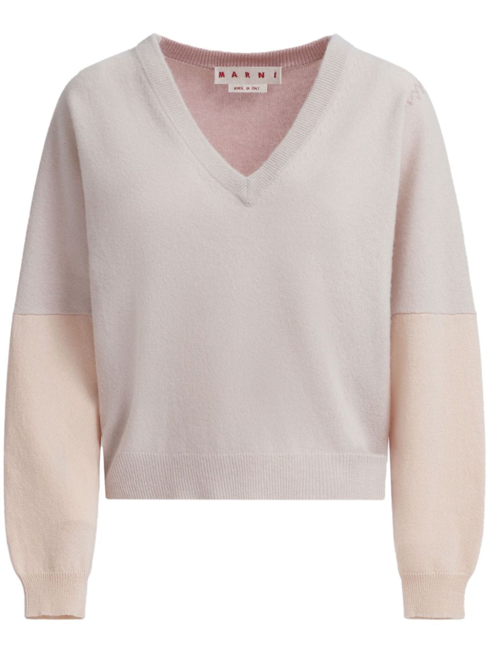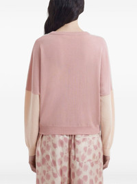 Combined-colour jumper Highlights - Blush pink - Virgin wool - Contrasting panel detail - Ribbed v-neck - Ribbed cuffs and hem - Zigzag embroidery Made in Italy Composition Virgin Wool 70%, Fabric 30%