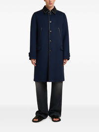 contrast collar logo-patch coat Highlights - Dark blue - Contrast collar - Flap pockets - Welt pockets - Logo patch to the back Made in Italy Composition Virgin Wool 100% Washing instructions Read Manufacturer Guidelines