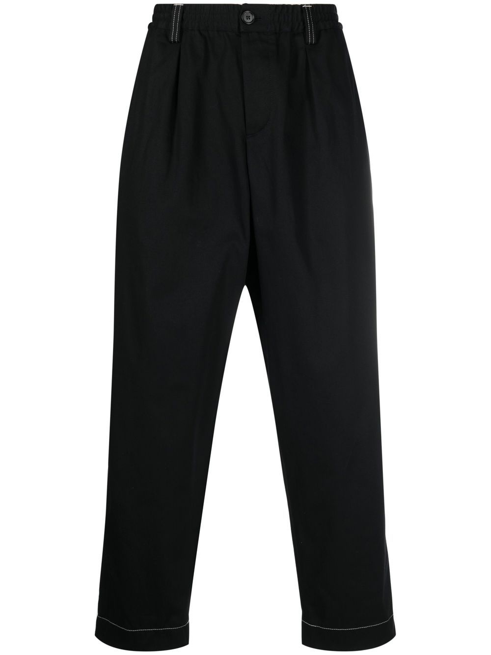 contrast-stitching trousers black cotton contrast stitching elasticated waistband belt loops two side slit pockets rear button-fastening jetted pocket straight leg Imported Composition Lining: Cotton 100% Outer: Cotton 100% SIZE & FIT Model measurements Height 6 ft 1 in(1.85 m) Bust/Chest 35.82 in(91 cm) Hips 37.79 in(96 cm) Waist 29.13 in(74 cm) FittingInformation This piece fits true to size. We recommend you get your regular size Designed for a slim fit at the waist and loose over the leg Made with a mid-weight non-stretch fabric Washing instructions Machine Wash
