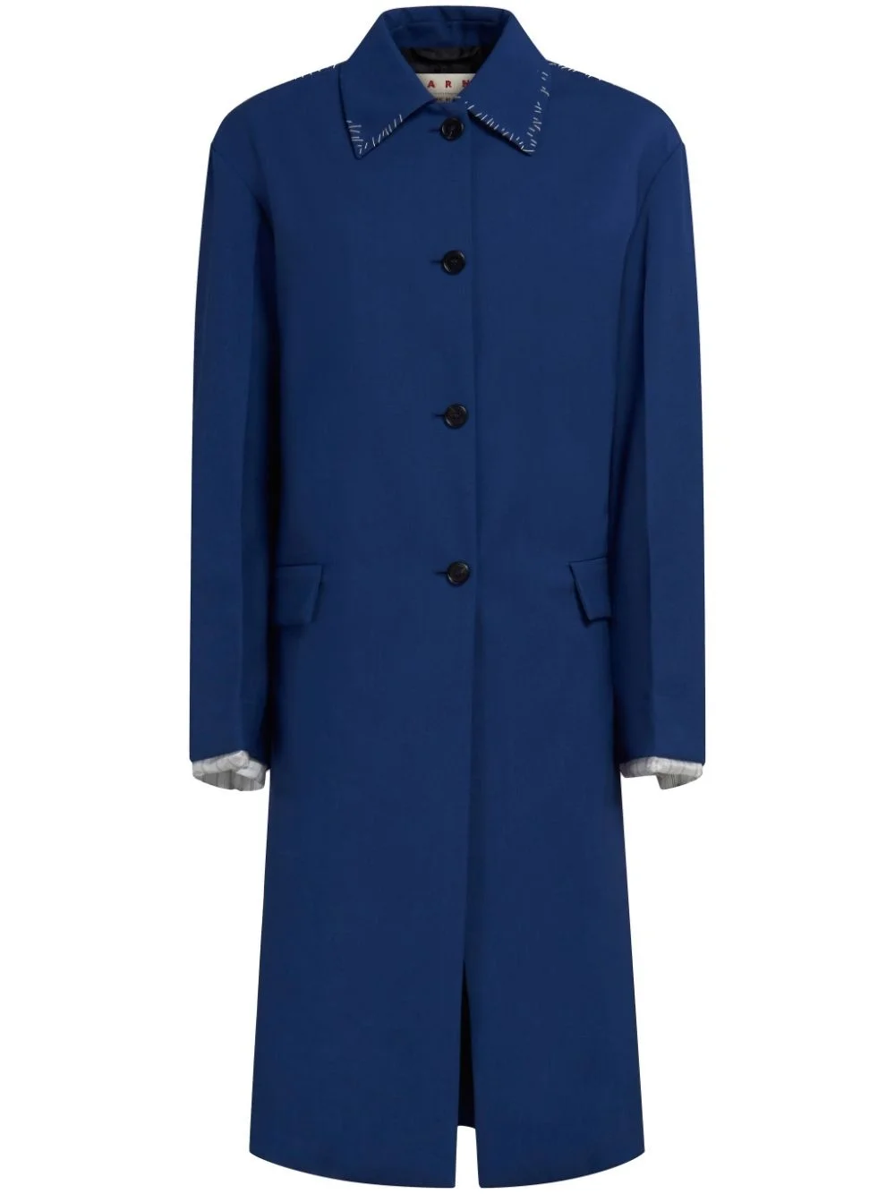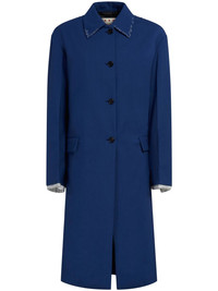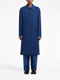 contrasting-stitch single-breasted coat Highlights - Ink blue/white - Virgin wool - Contrast stitching - Embroidered logo at the sleeve - Classic collar - Front button fastening - Long sleeves - Striped edge - Two front flap pockets - Martingale to the rear - Mid-length Made in Italy Composition Virgin Wool 100% Washing instructions Do Not Wash/Do Not Dry Clean