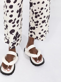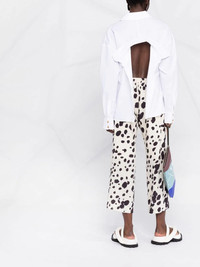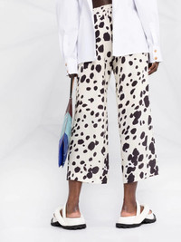 cow-print cropped trousers Showcasing the brand's penchant for bold colours and patterns, Marni presents these trousers. In white and brown hues, these trousers are cut to a cropped leg silhouette and stand out thanks to their eye-catching cow print. Made in Italy Composition Lining: Cupro 60%, Silk 40% Outer: Silk 100% SIZE & FIT Model measurements Height 5 ft 10 in(1.77 m) Bust/Chest 32.28 in(82 cm) Hips 35.03 in(89 cm) Waist 25.19 in(64 cm) FittingInformation This piece fits true to size. We recommend you get your regular size Designed to be fitted at the waist and hips, loose over the leg Made with a mid-weight non-stretch fabric Washing instructions Dry Clean Only
