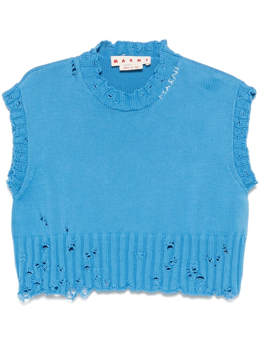 crew-neck sleeveless sweater Highlights - Cerulean blue - Embroidered logo - Distressed effect - Crew neck Made in Italy Composition Cotton 100% SIZE & FIT Model measurements Height 5 ft 9 in(1.76 m) Bust/Chest 31.1 in(79 cm) Hips 36.61 in(93 cm) Waist 24.8 in(63 cm) FittingInformation Designed to be unstructured, offering a loose fit throughout Made with a midweight knit, this piece offers some stretch