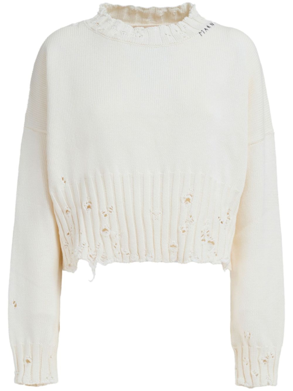 cropped distressed jumper This white Marni jumper puts a deconstructed spin on traditional knitwear codes. Its ribbed trims are shredded and distressed and a logo is hand-stitched at the neck for a grunge-inspired effect. Highlights - Ivory white - Cotton - Knitted construction - Distressed finish - Embroidered logo - Round neck - Drop shoulder - Long sleeves - Ribbed trim - Cropped Made in Italy Composition Cotton 100% SIZE & FIT Model measurements Height 5 ft 10 in(1.78 m) Bust/Chest 31.49 in(80 cm) Hips 35.03 in(89 cm) Waist 23.62 in(60 cm) FittingInformation Designed to be unstructured, offering a loose fit throughout Made with a midweight knit, this piece offers some stretch This piece fits true to size – take your usual size Washing instructions Dry Clean Only