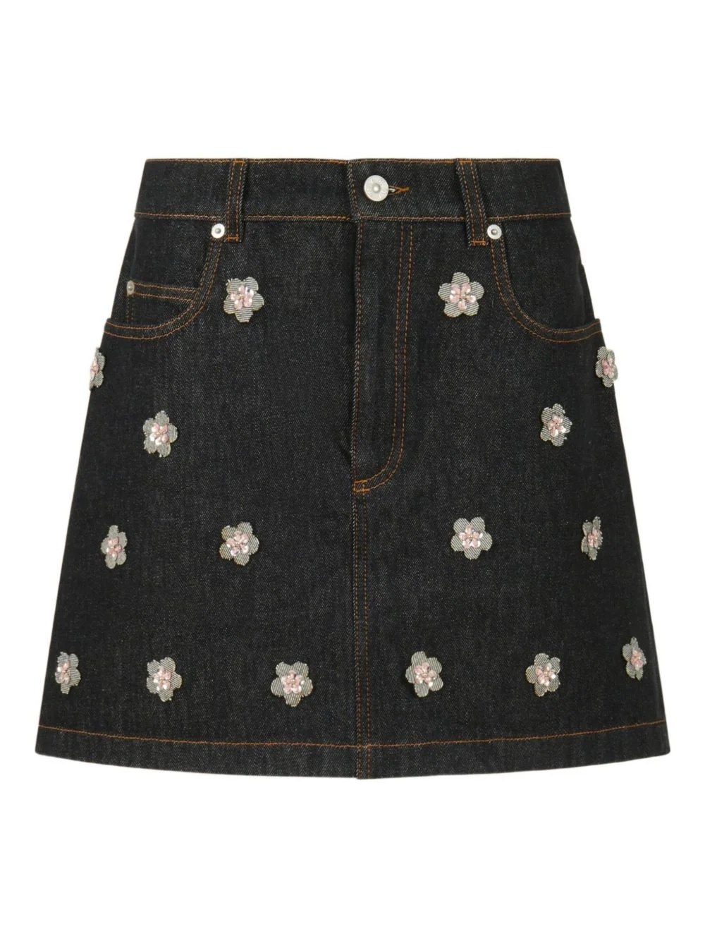 daisy-applique denim mini skirt Highlights - Dark blue - Five pockets - Daisy appliques - Embellishment details - Stitching - Leather patch Made in Italy Composition Cotton 100%, Calf Leather 100% Washing instructions Read Manufacturer Guidelines