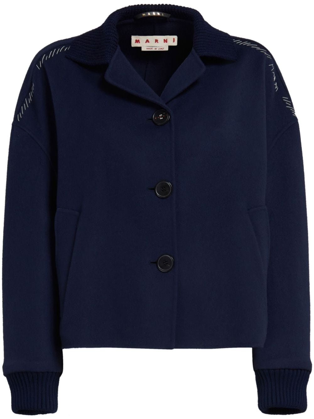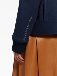 decorative-stitching wool-blend shirt jacket Highlights - Navy blue - Virgin wool-cashmere blend - Decorative stitching - Embroidered logo at the sleeve - Ribbed-knit edge - Camp collar - Front button fastening - Drop shoulder - Long sleeves - Ribbed cuffs - Two side slit pockets - Straight hem Made in Italy Composition Virgin Wool 90%, Cashmere 10% Washing instructions Read Manufacturer Guidelines
