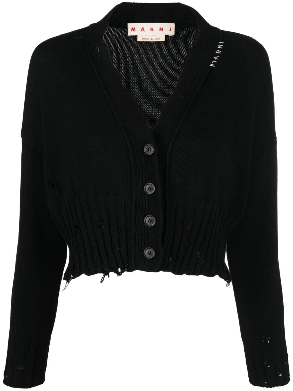 distressed cropped cardigan Marni’s offbeat aesthetic is proven with this cropped cardigan. It’s spun from cotton to a chunky knit construction with distressed trims. Hand-embroidered logo lettering traces the V-neck. Highlights - Black - Cotton - Chunky knit - Distressed finish - Embroidered logo - V-neck - Front button fastening - Long sleeves - Cropped Made in Italy Composition Cotton 100% SIZE & FIT Model measurements Height 5 ft 10 in(1.79 m) Bust/Chest 31.49 in(80 cm) Hips 35.03 in(89 cm) Waist 23.62 in(60 cm)