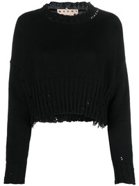 distressed cropped jumper Marni's bold and playful take on garments permeates the brand's latest offer, as shown by this black crew neck jumper. Woven from soft cotton, the design is defined by a cropped length and ripped accents for a distressed look. Highlights - Black - Cotton - Knitted construction - Crew neck - Long sleeves - Ripped detailing - Cropped Made in Italy Composition Outer: Cotton 100% SIZE & FIT Model measurements Height 5 ft 10 in(1.78 m) Bust/Chest 29.92 in(76 cm) Hips 34.64 in(88 cm) Waist 23.62 in(60 cm) FittingInformation Designed for a relaxed fit, this piece allows for comfort and movement when worn Cropped in length Made with a midweight knit, this piece offers some stretch This piece fits true to size – take your usual size