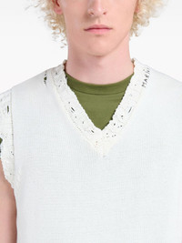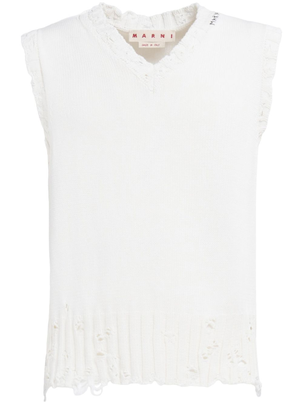 distressed sweater vest Heavy distressing and a hand-stitched logo at the V-neck lend this white cotton Marni sweater vest a well-worn finish. Highlights - White - Cotton - Knitted construction - Distressed finish - Embroidered logo to the front - Ribbed v-neck - Sleeveless - Ribbed cuffs and hem Made in Italy Composition Cotton 100% SIZE & FIT Model measurements Height 6 ft 2 in(1.88 m) Bust/Chest 36.61 in(93 cm) Hips 35.82 in(91 cm) Waist 27.95 in(71 cm) Measurement CHEST 39.37 in(100 cm) WAIST 38.58 in(98 cm) FittingInformation Designed for a relaxed fit, this piece allows for comfort and movement when worn Made with a midweight knit, this piece offers some stretch This piece fits true to size – take your usual size Washing instructions Dry Clean Only