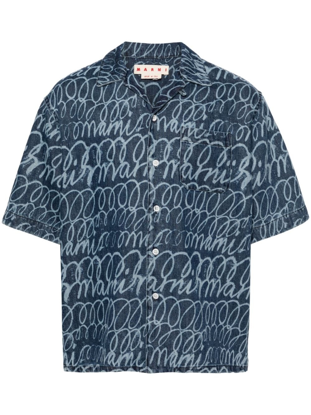 echoes-print denim shirt Highlights - Indigo blue - Cotton - Denim - Lasered bleached echoes - Camp collar - Front button fastening - Short sleeves - Straight hem - Chest patch pocket Made in Italy Composition Cotton 100% SIZE & FIT Model measurements Height 6 ft 2 in(1.88 m) Bust/Chest 36.61 in(93 cm) Hips 35.82 in(91 cm) Waist 27.95 in(71 cm) FittingInformation Designed for a boxy fit, intended for a loose fit throughout Sturdy and hard-wearing, this denim piece offers no stretch This piece fits true to size – take your usual size