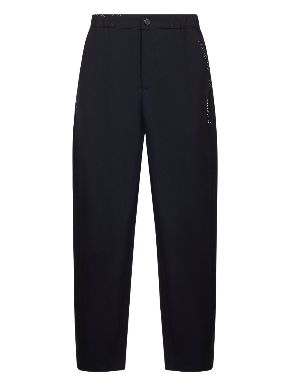 embroidered pocket trousers Highlights - Dark blue - Elasticated waistband - Zip fly button closure - Slanted side pockets - Hand-stitched embroidery Made in Italy Composition Virgin Wool 100% Washing instructions Read Manufacturer Guidelines