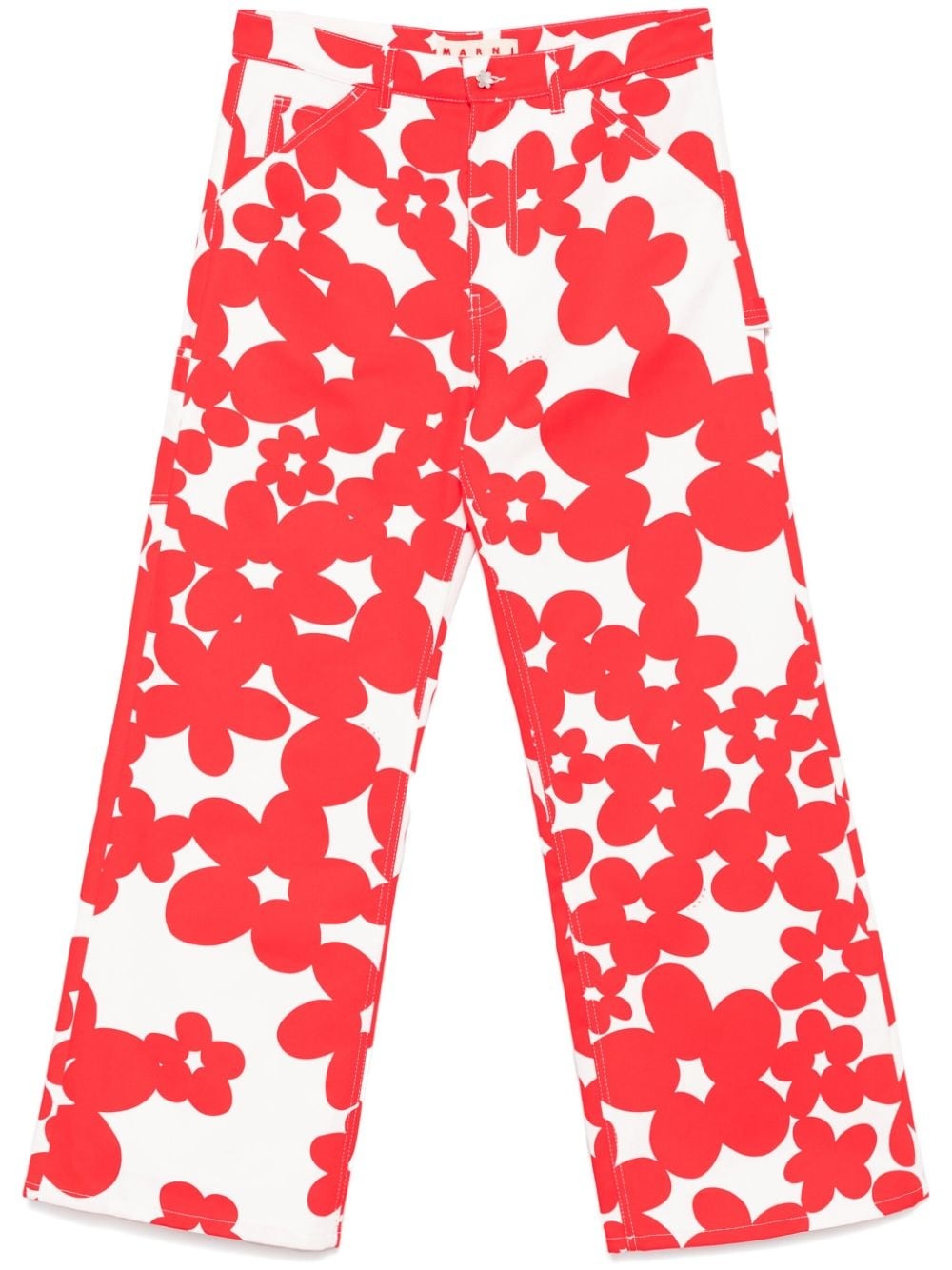 floral-print gabardine trousers Highlights - Red/white - Cotton - Gabardine weave - All-over floral print - Concealed fly and button fastening - Belt loops - Classic five pockets - Wide leg Made in Italy Composition Lining: Cotton 100% Outer: Cotton 100% SIZE & FIT Model measurements Height 6 ft 1 in(1.85 m) Bust/Chest 35.82 in(91 cm) Hips 37.79 in(96 cm) Waist 29.13 in(74 cm) FittingInformation Designed with a wide leg, offering a loose and roomy fit Made from a midweight non-stretch fabric