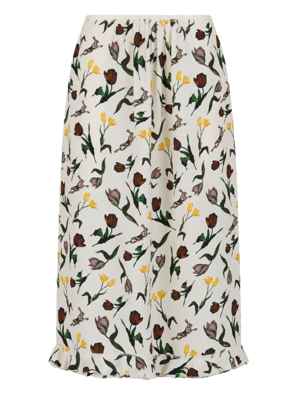 CREAM ENVERS SATIN MIDI SKIRT WITH TULIPS AND HARES PRINT