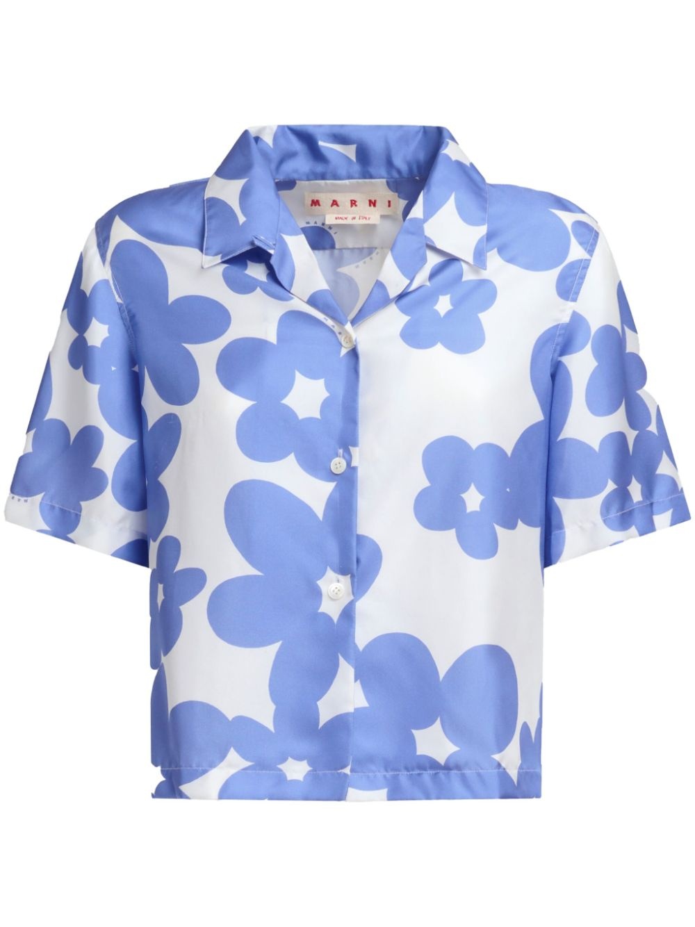 floral-print shirt Highlights - Lilac purple/white - Silk - All-over floral print - Cuban collar - Front button fastening - Short sleeves - Straight hem - Cropped Made in Italy Composition Silk 100%