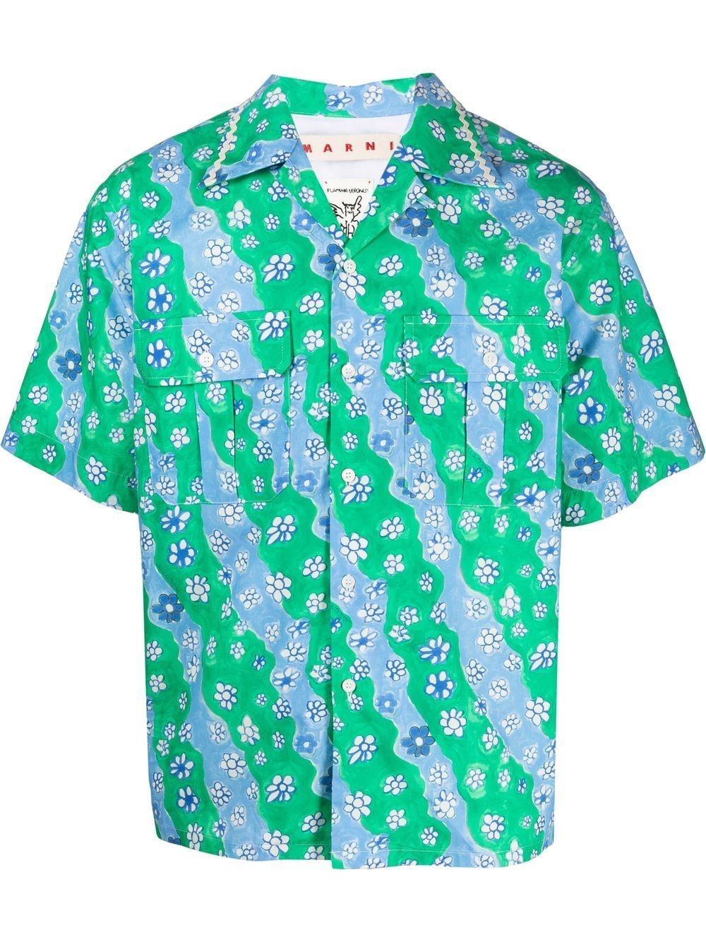 floral-print short-sleeved shirt sea green/light blue cotton all-over floral print spread collar front button fastening short sleeves two chest flap pockets straight hem Imported Composition Cotton 100% SIZE & FIT Model measurements Height 6 ft 2 in(1.87 m) Bust/Chest 35.82 in(91 cm) Hips 35.43 in(90 cm) Waist 27.95 in(71 cm) FittingInformation This piece fits true to size. We recommend you get your regular size Cut for a loose fit Made with a mid-weight non-stretch fabric Washing instructions Machine Wash