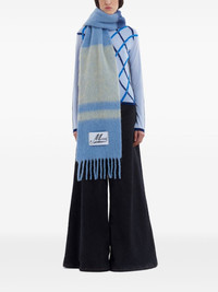 fringed brushed-knit scarf Highlights - Blue - Mohair-wool blend - Knitted construction - Brushed finish - Horizontal stripe pattern - Logo patch to the front - Rectangle shape - Fringed edge Made in Italy Composition Mohair 28%, Alpaca Wool 28%, Virgin Wool 24%, Polyamide 20% SIZE & FIT Measurement LENGTH 86.61 in(220 cm) WIDTH 11.81 in(30 cm)