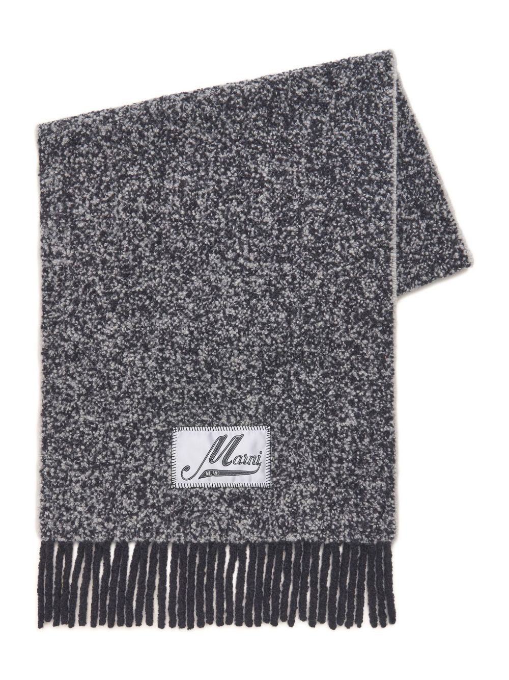 fringed scarf Highlights - Grey - Fringed ends - Logo patch - Speckled pattern - Rectangular shape Made in Italy Composition Cotton 90%, Polyamide 10% SIZE & FIT Measurement LENGTH 82.67 in(210 cm) WIDTH 15.74 in(40 cm) Washing instructions Read Manufacturer Guidelines