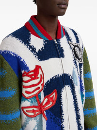 graphic-knitted cardigan Highlights - White and multicoloured - Contrasting stripes - Embroidered motifs - Ribbed cuffs - Zip fastening Made in Italy Composition Virgin Wool 100% Washing instructions Read Manufacturer Guidelines