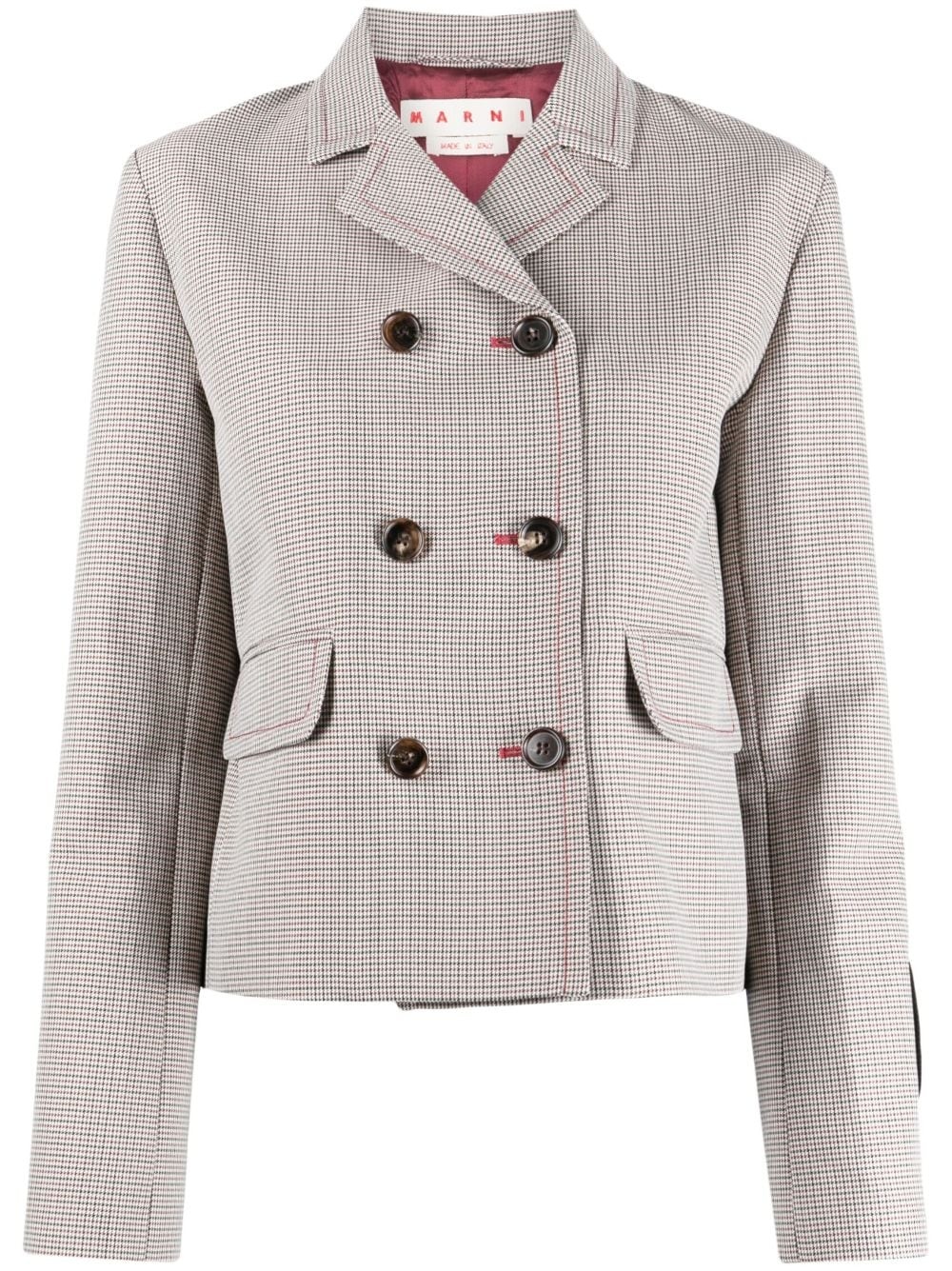 houndstooth-pattern double-breasted blazer Highlights - Beige/dark red/black - Wool blend - Houndstooth pattern - Logo patch at the sleeve - Notched lapels - Double-breasted button fastening - Long sleeves - Buttoned cuffs - Two front flap pockets Made in Italy Composition Outer: Wool 54%, Polyester 46% Lining: Viscose 100% SIZE & FIT Model measurements Height 5 ft 10 in(1.78 m) Bust/Chest 31.49 in(80 cm) Hips 37 in(94 cm) Waist 23.62 in(60 cm) FittingInformation Designed for a boxy fit, intended for a loose fit throughout Made from a midweight non-stretch fabric This piece fits true to size – take your usual size Washing instructions Dry Clean Only