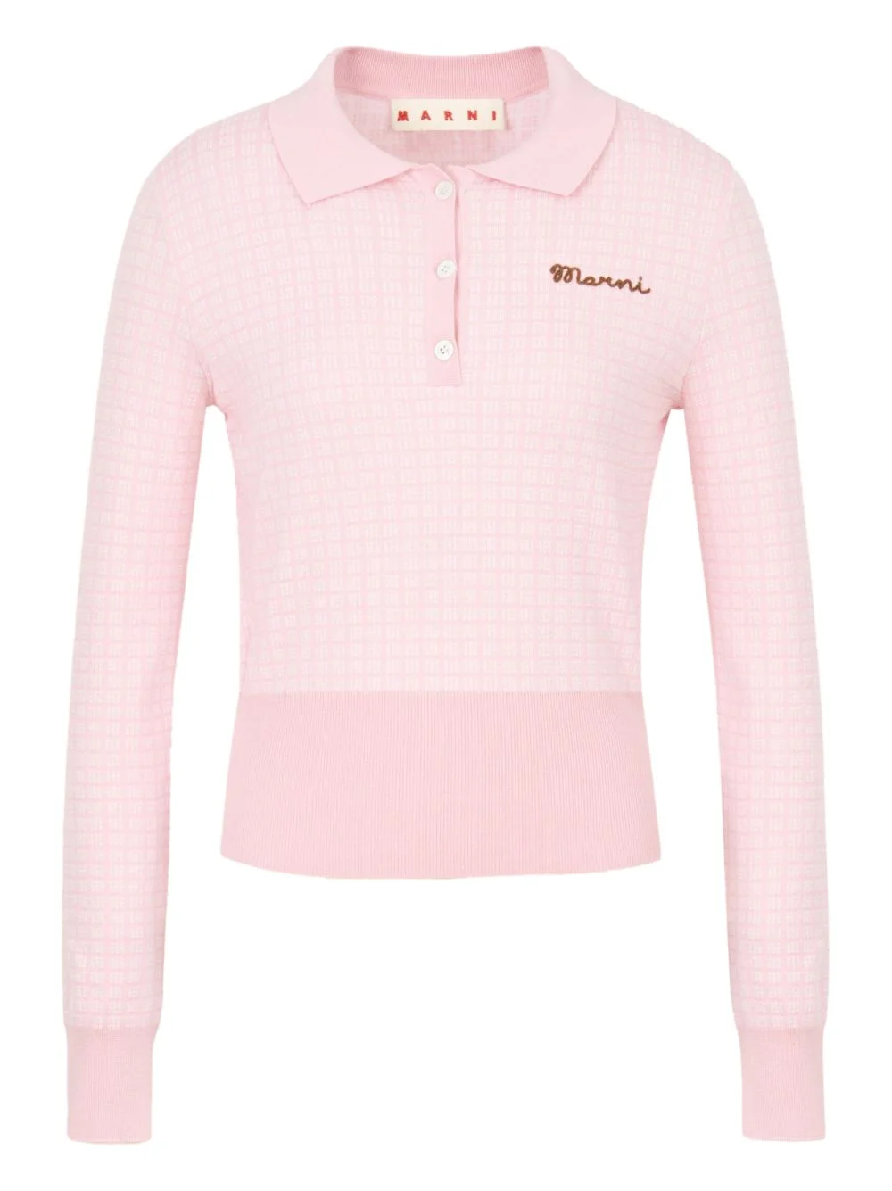 jacquard embroidered polo shirt Highlights - Light pink - Tonal checked pattern - Button placket - Ribbed hem - Ribbed cuffs - Embroidered logo Imported Composition Virgin Wool 86%, Wool 50%, Silk 14% Washing instructions Read Manufacturer Guidelines