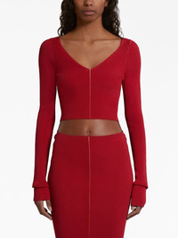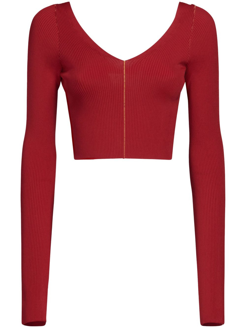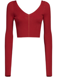 ribbed V-neck jumper Highlights - Blood red - Knitted construction - V-neck - Open back - Long sleeves - Cropped Made in Italy Composition Viscose 94%, Polyester 6% SIZE & FIT FittingInformation Designed for a close fit throughout Made with a midweight knit, this piece offers some stretch This piece fits true to size – take your usual size Washing instructions Read Manufacturer Guidelines