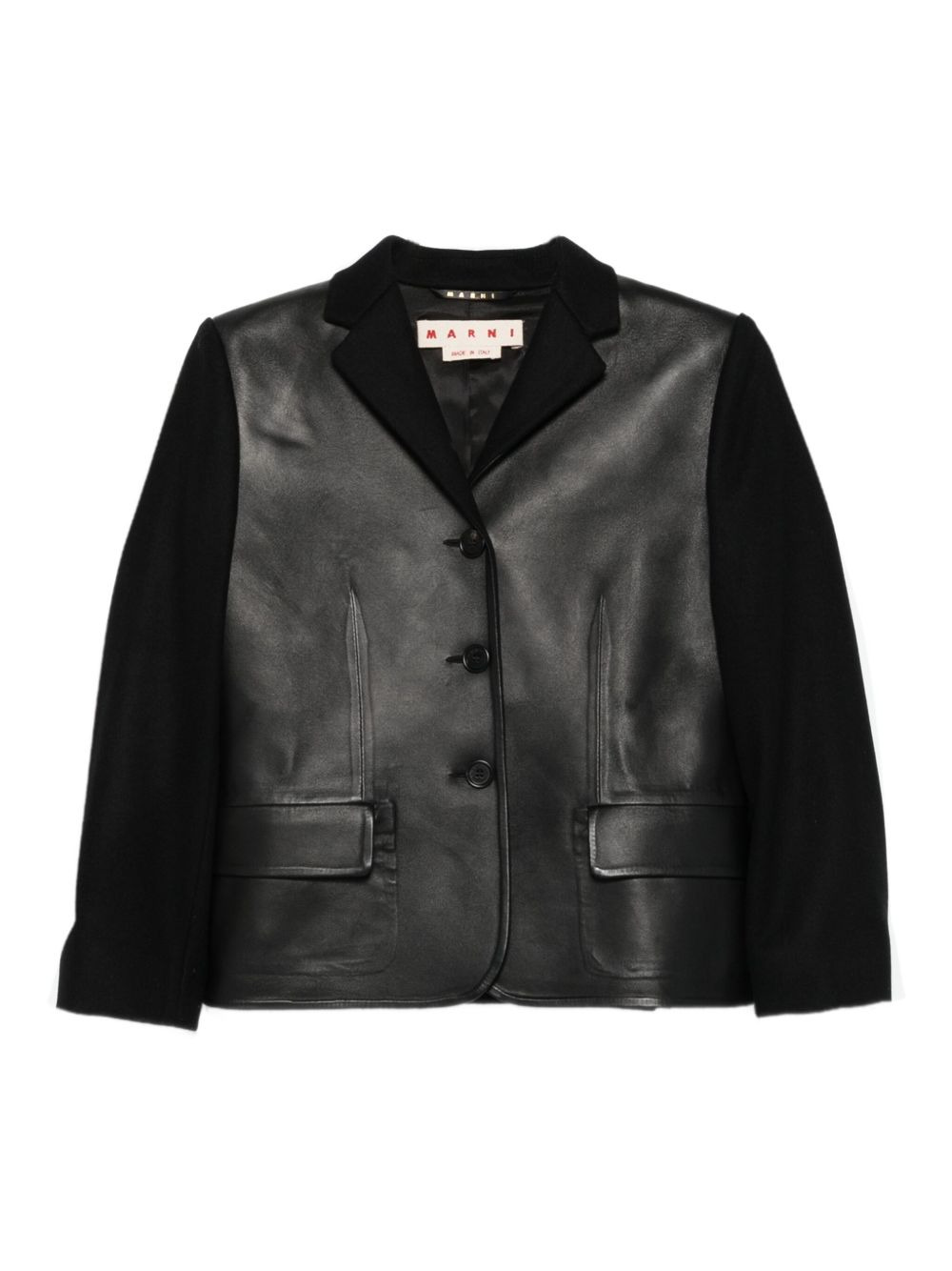 leather-paneled wool jacket Highlights - Black - Leather panels - Three button fastening - Notched lapel - Long sleeves - Welt pockets Made in Italy Composition Leather 100%, Wool 100% SIZE & FIT Model measurements Height 5 ft 10 in(1.77 m) Bust/Chest 33.07 in(84 cm) Hips 37 in(94 cm) Waist 24.8 in(63 cm) Washing instructions Read Manufacturer Guidelines