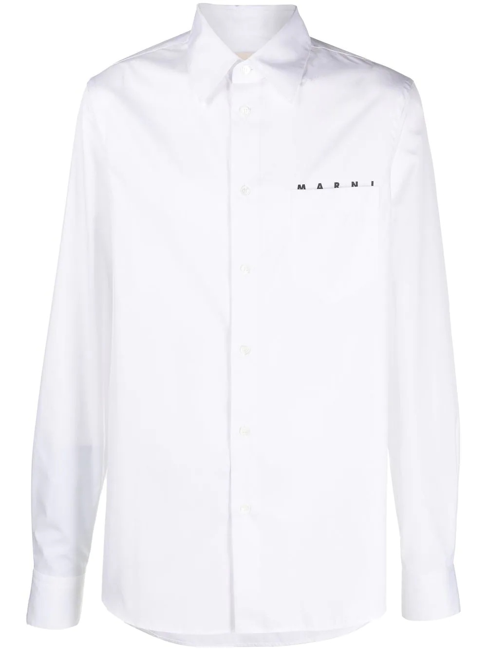 logo-print long-sleeve shirt logo-print long-sleeve shirt from MARNI featuring white, cotton, logo print at the chest, chest patch pocket, classic collar, long sleeves and front button fastening. Imported Composition Cotton 100% SIZE & FIT Model measurements Height 6 ft 2 in(1.87 m) Bust/Chest 36.41 in(92.5 cm) Hips 37 in(94 cm) Waist 29.52 in(75 cm) FittingInformation Designed to be unstructured, offering a loose fit throughout Made from a midweight non-stretch fabric This piece fits true to size – take your usual size Measurement WAIST 40 in(101.6 cm) SLEEVE LENGTH 26.49 in(67.3 cm) CHEST 40.98 in(104.1 cm) Shoulder Width 17 in(43.2 cm) Washing instructions Machine Wash