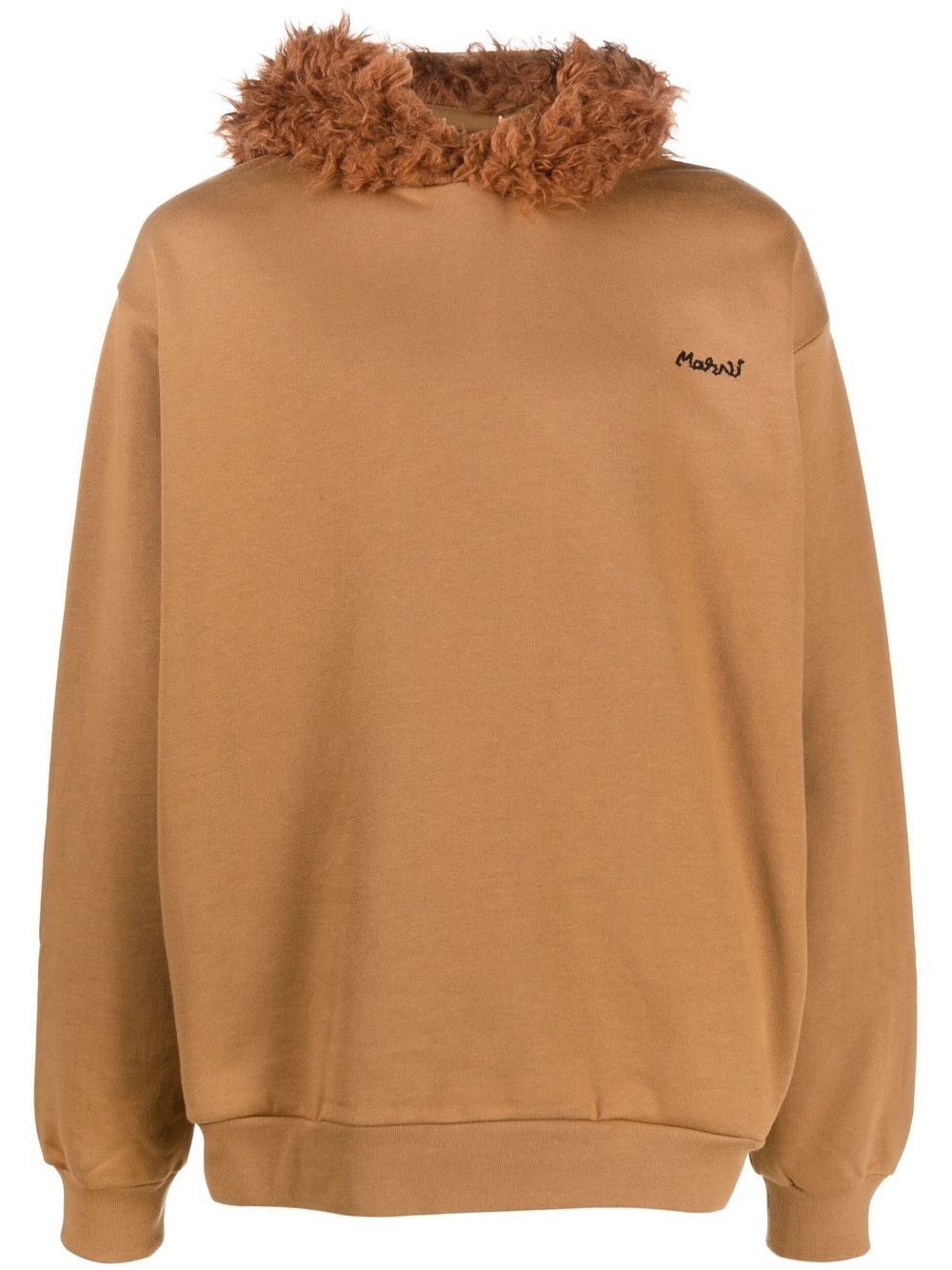 logo-embroidered hoodie Marni is a luxury fashion brand founded in Milan, in 1994 that celebrates individuality through bold designs with graphic, and unpredictable details. This brown hoodie, which is part of the brand's AW22 collection, is crafted from a cotton-wool blend and is enhanced with faux fur detailing on the hood. Imported Composition Cotton 100%, Modacrylic 60%, Acetate 30%, Wool 10% SIZE & FIT Model measurements Height 6 ft 2 in(1.87 m) Bust/Chest 38.18 in(97 cm) Hips 36.61 in(93 cm) Waist 29.13 in(74 cm) FittingInformation This piece fits true to size. We recommend you get your regular size Cut for a loose fit Made with a mid-weight fabric Washing instructions Dry Clean Only