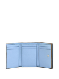 logo-embroidered leather wallet Highlights - Camel brown/light blue - Leather - Grained texture - Embroidered logo to the front - Tri-fold design - Press-stud fastening - Coin pocket - Internal note compartments - Internal card slots - Contrast lining Made in Italy Composition Lining: Ovine Leather (top grain) 100%, Viscose 100% Outer: Polyester 100%, Calf Leather 100% SIZE & FIT Measurement DEPTH 0.98 in(2.5 cm) LENGTH 2.75 in(7 cm) WIDTH 3.93 in(10 cm)