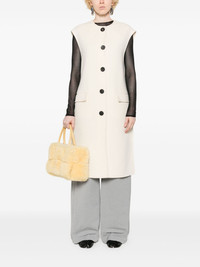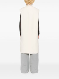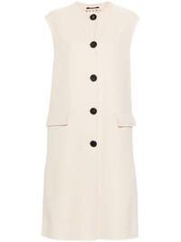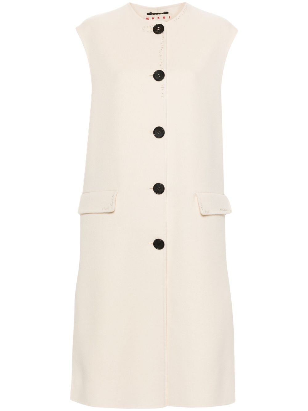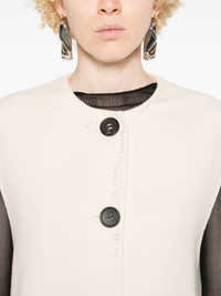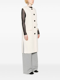 logo-embroidered sleeveless coat Highlights - Cream white - Virgin wool-cashmere blend - Felted finish - Round neck - Sleeveless - Two side flap pockets - Decorative stitching - Embroidered logo to the front - Side slits - Unlined - Straight hem - Front button fastening Made in Italy Composition Calf Leather 100%, Virgin Wool 90%, Cashmere 10% SIZE & FIT Model measurements Height 5 ft 9 in(1.75 m) Bust/Chest 34.64 in(88 cm) Hips 36.61 in(93 cm) Waist 26.37 in(67 cm) FittingInformation Designed to be unstructured, offering a loose fit throughout Made from a midweight non-stretch fabric This piece fits true to size – take your usual size