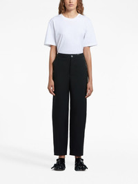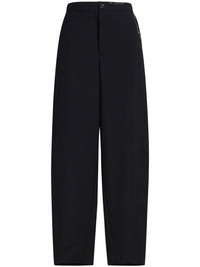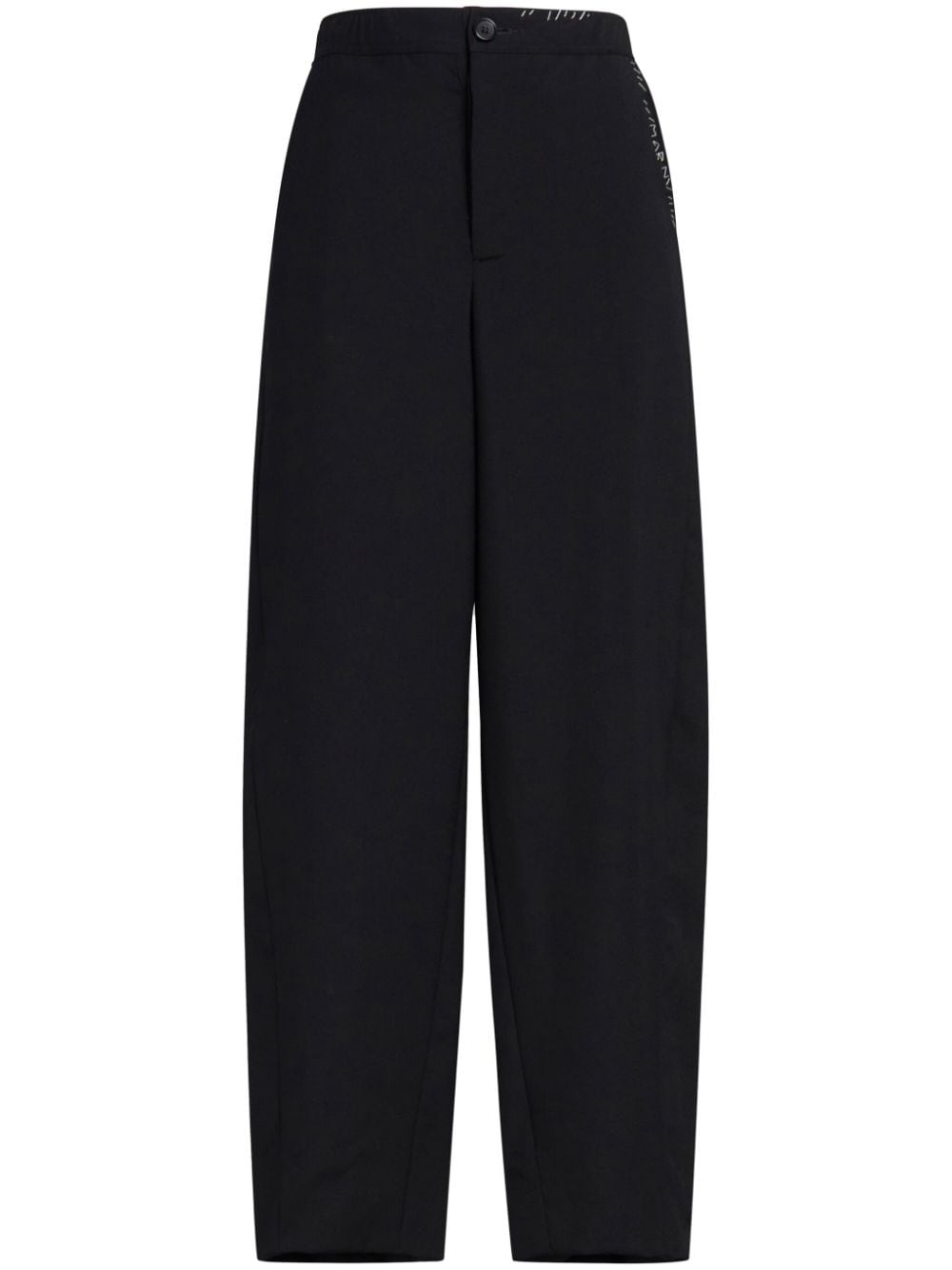 logo-embroidered tapered trousers Highlights - Black - Virgin wool - Embroidered logo to the front - Straight leg - High waist - Rear elasticated waistband - Front button and zip fastening - Two side inset pockets - Two rear welt pockets Made in Italy Composition Virgin Wool 100% SIZE & FIT FittingInformation Designed for a tapered fit, these trousers allow for a close fit at the waist and a loose unrestricted fit over the leg with a closer fit towards the ankle The elasticated waist allows for a comfortable fit Made from a midweight non-stretch fabric Washing instructions Do Not Wash/Do Not Dry Clean