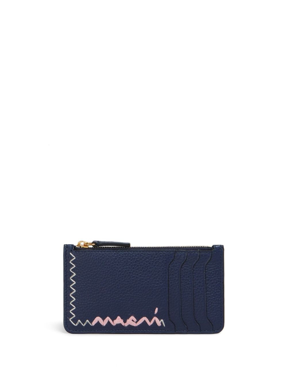 logo-embroidered wallet Highlights - Navy blue - Calf leather - Grained texture - Embroidered logo to the front - Whipstitch detailing - Zip-fastening compartment - Card slots - Debossed internal logo Made in Italy Composition Outer: Calf Leather 100%, Polyester 100%, Cotton 100%, Brass 100%, Zamak 100% Lining: Sheepskin 100%, Viscose 100% SIZE & FIT Measurement LENGTH 5.11 in(13 cm) WIDTH 2.75 in(7 cm)