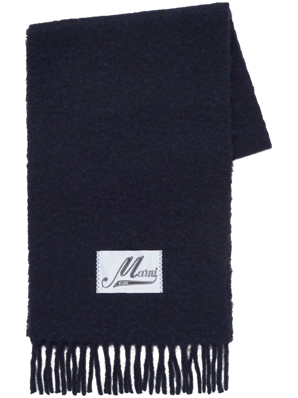 logo-applique alpaca scarf Top off your outfit with a Marni accessory. Crafted from a blend of alpaca wool, this fringed scarf will keep you warm and stylish in equal doses. Versatile. Highlights - Midnight blue - Alpaca blend - Knitted construction - Logo patch to the front - Fringed edge Made in Italy Composition Alpaca Wool 80%, Polyamide 20% SIZE & FIT Model measurements Height 5 ft 10 in(1.78 m) Bust/Chest 31.49 in(80 cm) Hips 36.22 in(92 cm) Waist 25.59 in(65 cm)