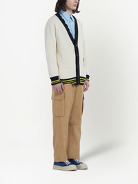 logo-patch knitted cardigan beige/navy blue knitted construction ribbed knit logo patch to the front stripe detailing V-neck front button fastening two front jetted pockets long sleeves straight hem Made in Italy Composition Body: Wool 100%, Cotton 100%