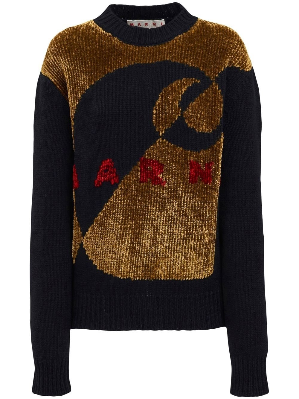 logo print knitted sweater black/brown virgin wool/silk knitted construction embroidered logo to the front crew neck long sleeves ribbed cuffs ribbed hem Made in Italy Composition Virgin Wool 100%, Silk 100%