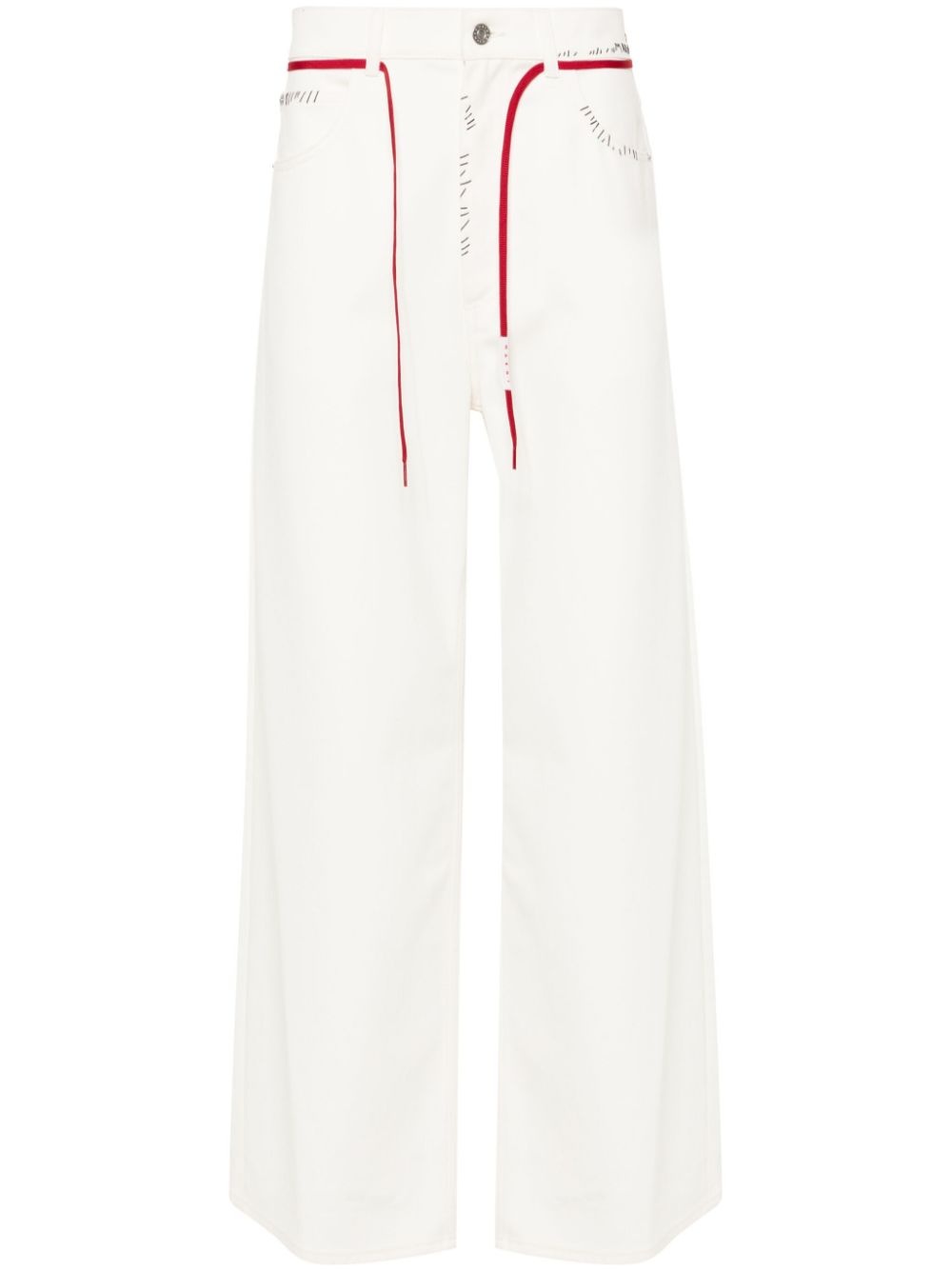 logo-mending jeans Cut in Italy to a relaxed straight-leg silhouette, these white jeans are embedded with Marni's playful identity thanks to a tie-style waist and irregular embroidered logo at the side. Highlights - White - Cotton - Denim - Concealed fly and button fastening - Mid-rise - Belt loops - Tied waist - Decorative stitching - Embroidered logo to the side - Classic five pockets - Logo patch to the rear - Straight leg Made in Italy Composition Cotton 100% SIZE & FIT Model measurements Height 6 ft 1 in(1.86 m) Bust/Chest 36.61 in(93 cm) Hips 37 in(94 cm) Waist 28.74 in(73 cm) FittingInformation Designed with a wide leg, these jeans offer a loose and roomy fit Adjust this piece’s waistband to your preference using the drawstring Sturdy and hard-wearing, this denim piece offers no stretch Measurement FRONT RISE 13.5 in(34.3 cm) INSIDE LEG 30.98 in(78.7 cm) Hem Width 25.98 in(66 cm) WAIST 34.01 in(86.4 cm)