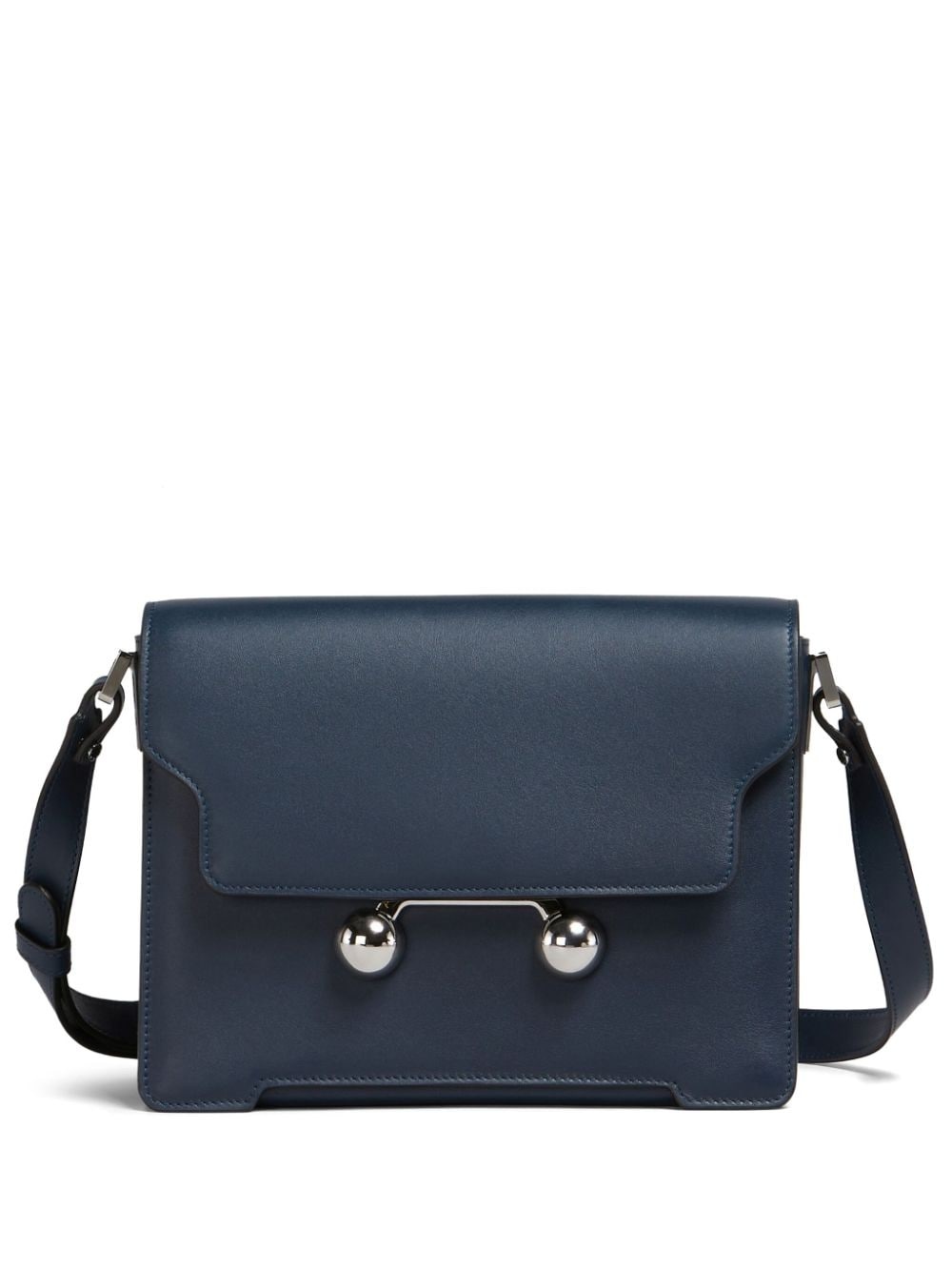 medium Trunkaroo leather shoulder bag Highlights - Midnight blue - Calf leather - Smooth grain - Logo-engraved silver-tone hardware - Oversized stud detailing - Adjustable detachable shoulder strap - Foldover top with magnetic fastening - Main compartment - Internal patch pocket - Leather lining Made in Italy Composition Lining: Lamb Skin 100% Outer: Calf Leather 100%, Brass 100%, Steel 100% SIZE & FIT Measurement WIDTH 9.05 in(23 cm) HEIGHT 6.69 in(17 cm) STRAP 40.55 in(103 cm) DEPTH 3.14 in(8 cm)
