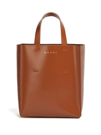 mini Museo leather tote bag Marni updates its classic Museo bag for AW23. Crafted from smooth calf leather in a cognac brown colourway, this mini-sized iteration features a detachable and adjustable logo-jacquard shoulder strap for a branded look. Highlights - Cognac brown - Calf leather - Smooth grain - Logo stamp to the front - Two flat top handles - Adjustable logo-jacquard shoulder strap - Open top - Main compartment - Internal slip pocket - Internal logo patch - Removable lining - Logo-engraved gold-tone hardware Made in Italy Composition Outer: Calf Leather 100% SIZE & FIT Measurement DEPTH 3.93 in(10 cm) HANDLE 3.93 in(10 cm) HEIGHT 8.66 in(22 cm) STRAP 47.24 in(120 cm) WIDTH 7.87 in(20 cm) Washing instructions Do Not Wash/Do Not Dry Clean