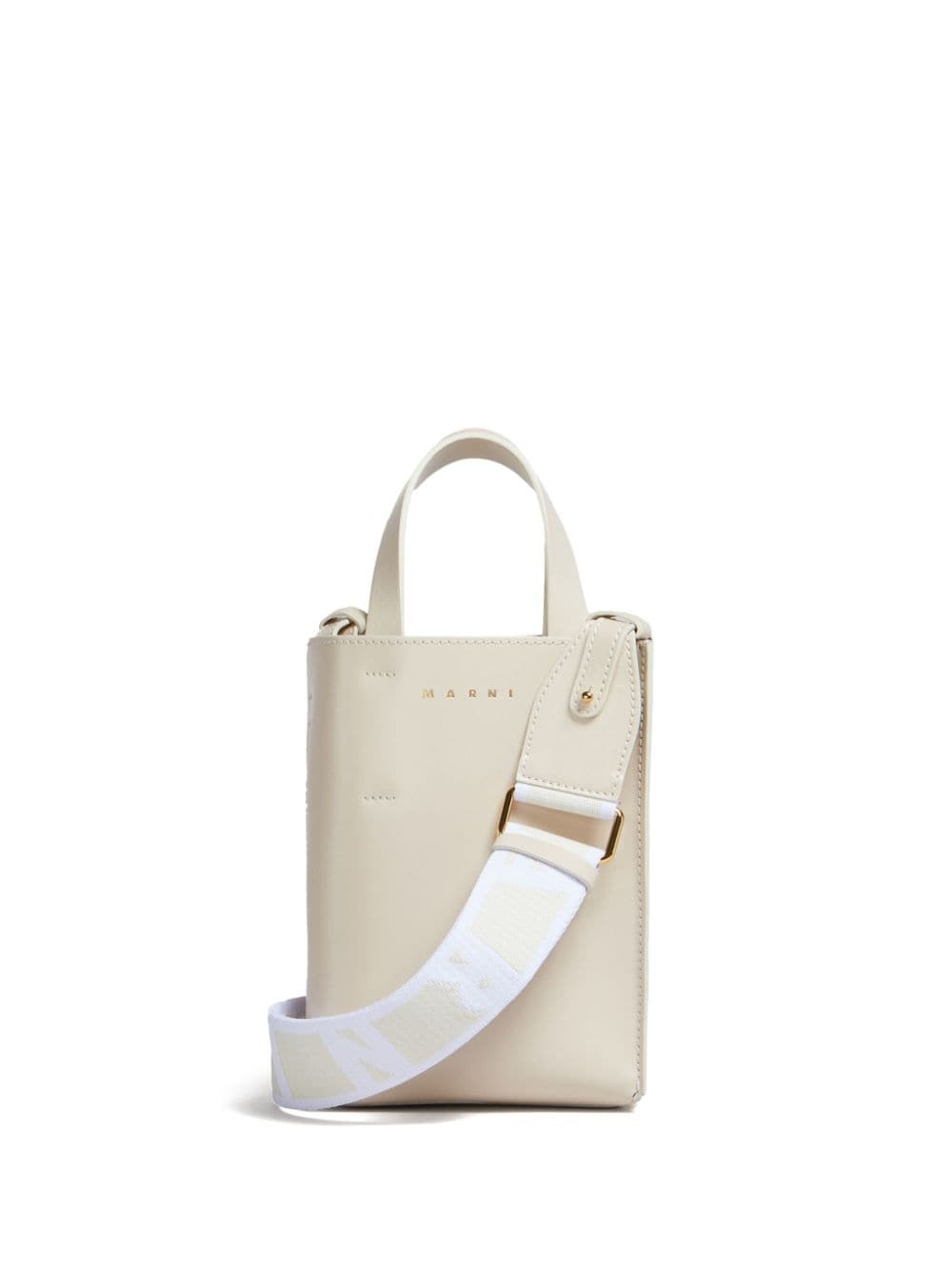 Museo Nano mini tote bag Highlights - Off-white - Calf leather - Gold-tone hardware - Debossed logo to the front - Internal logo patch - Two flat top handles - Partitioned compartment - Adjustable logo-jacquard shoulder strap Made in Italy Composition Outer: Calf Leather 100% SIZE & FIT Measurement WIDTH 5.51 in(14 cm) HEIGHT 7.48 in(19 cm) DEPTH 2.36 in(6 cm) HANDLE 3.54 in(9 cm) STRAP 20.47 in(52 cm) Washing instructions Do Not Wash/Do Not Dry Clean