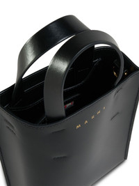 nano Museo leather tote bag Marni updates its classic Museo bag for AW23. Crafted from smooth calf leather in an all-black colourway, this nano-sized iteration features a detachable and adjustable logo-jacquard shoulder strap for a branded look. Highlights - Black/white - Calf leather - Smooth grain - Logo stamp to the front - Two flat top handles - Adjustable logo-jacquard shoulder strap - Open top - Main compartment - Internal slip pocket - Internal logo patch - Logo-engraved gold-tone hardware Made in Italy Composition Leather 100% SIZE & FIT Measurement DEPTH 2.36 in(6 cm) HEIGHT 7.48 in(19 cm) WIDTH 5.51 in(14 cm) HANDLE 3.54 in(9 cm) STRAP 20.47 in(52 cm) Washing instructions Do Not Wash/Do Not Dry Clean