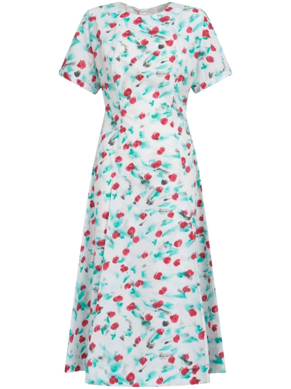 painterly-print cotton midi dress This midi dress captures Marni's vibrant, playful aesthetic. It's cut from cotton in Italy to an A-line silhouette and decorated with a painterly print that resembles red roses against a white backdrop. Highlights - White/multicolour - Cotton - Painterly print - Round neck - Short sleeves - A-line skirt - Mid-calf length - Concealed rear zip fastening - Straight hem Made in Italy Composition Cotton 100% Washing instructions Do Not Wash/Do Not Dry Clean