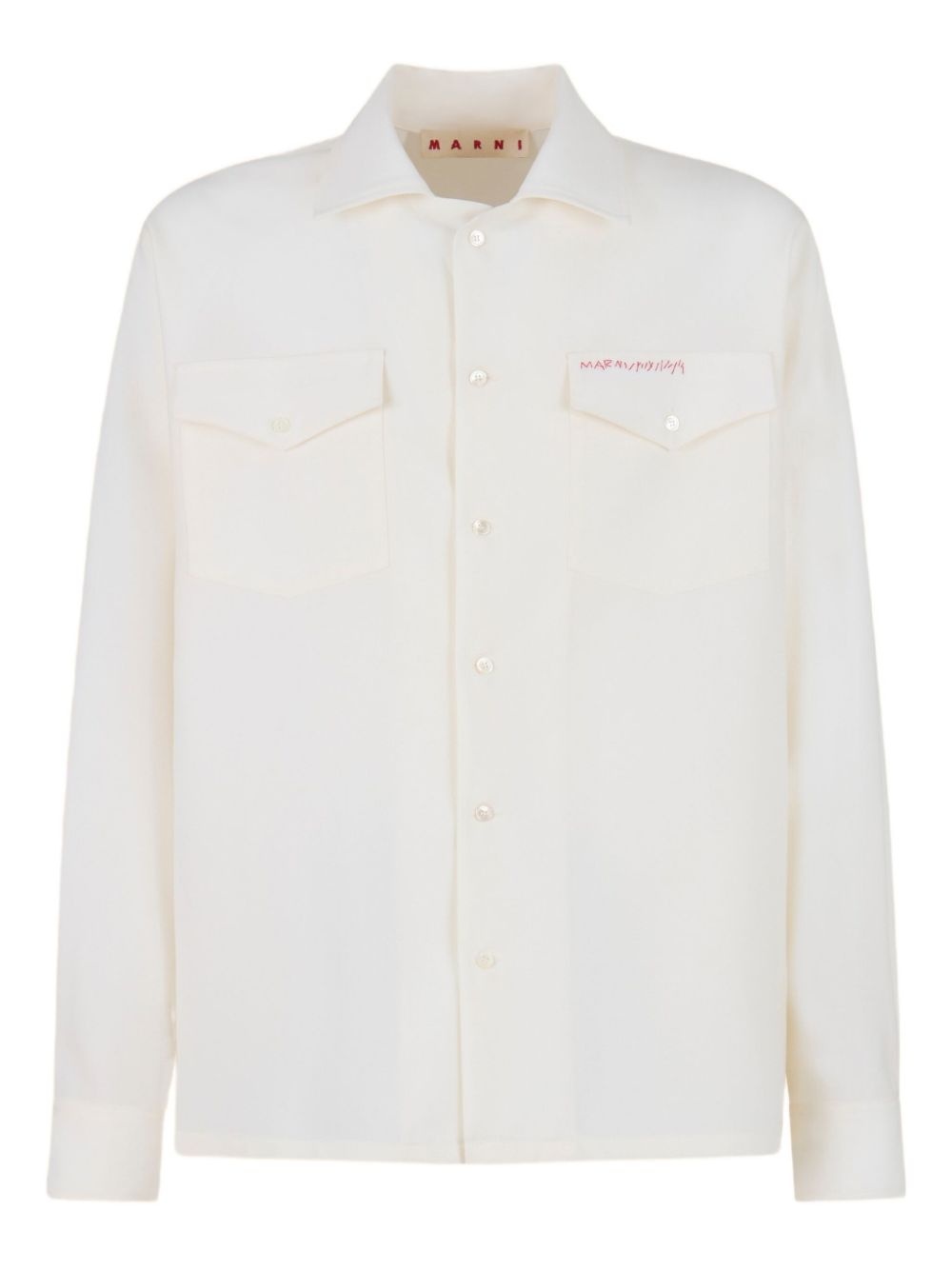 patch pockets button-up shirt Highlights - White - Two chest pockets - Embroidered logo detail - Button fastening - Notched collar Imported Composition Virgin Wool 100% SIZE & FIT FittingInformation Designed to be unstructured, offering a loose fit throughout Made from a midweight non-stretch fabric Washing instructions Read Manufacturer Guidelines