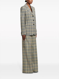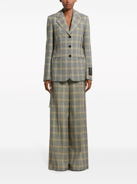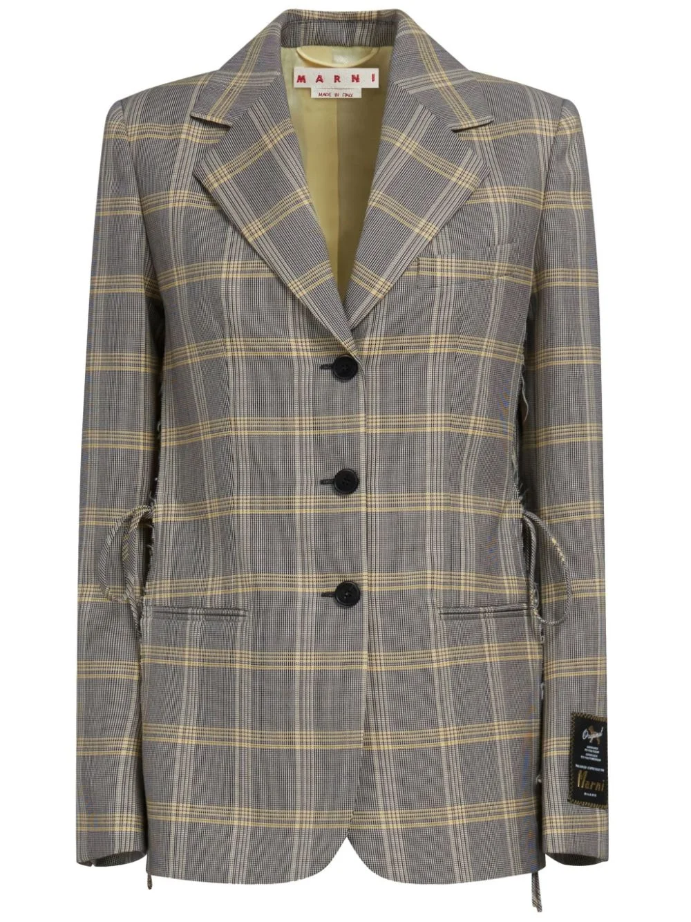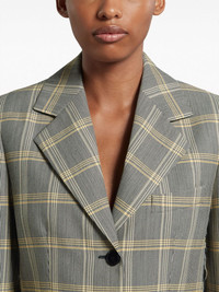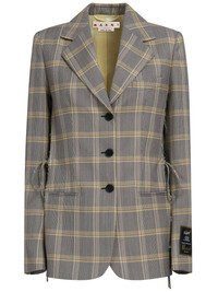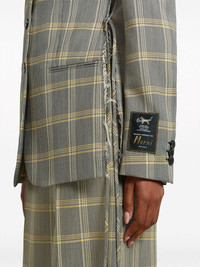 plaid-check single-breasted ripped blazer Highlights - Medium grey/lemon yellow/jet black - Virgin wool blend - Plaid check pattern - Ripped detailing - Logo patch at the sleeve - Peak lapels - Front button fastening - Side drawstring fastening - Long sleeves - Buttoned cuffs - Chest welt pocket - Two front jetted pockets - English rear vents - Straight hem Made in Italy Composition Virgin Wool 57%, Polyester 43% Washing instructions Do Not Wash/Do Not Dry Clean