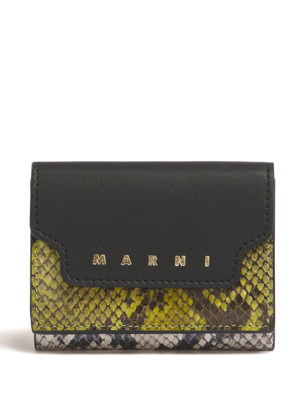 python-print wallet Highlights - Black - Python print panels - Snap button fastening - External coin pocket - Note compartment - Six card slots Made in Italy Composition Calf Leather 100%, Ovine Leather (top grain) 100%, Brass 100%, Viscose 100%