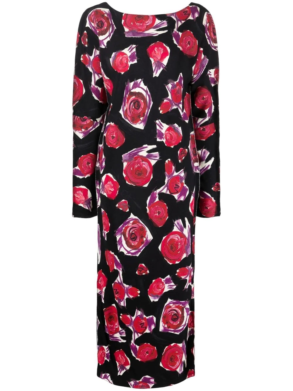 rose print long dress Marni's artistic rose motif - a recurring theme throughout the AW22 collection, comes to life on this striking scoop neck long dress. Highlights - Black - Scoop neck - Long sleeves - All-over rose print - Rear zip fastening - Long length Made in Italy Composition Viscose 100% SIZE & FIT Model measurements Height 5 ft 10 in(1.78 m) Bust/Chest 31.49 in(80 cm) Hips 35.43 in(90 cm) Waist 24.4 in(62 cm) Measurement HIPS 37.79 in(96 cm) LENGTH 48.81 in(124 cm) WAIST 34.64 in(88 cm) FittingInformation This piece fits true to size. We recommend you get your regular size Cut for a loose fit Made with a mid-weight non-stretch fabric Washing instructions Dry Clean Only